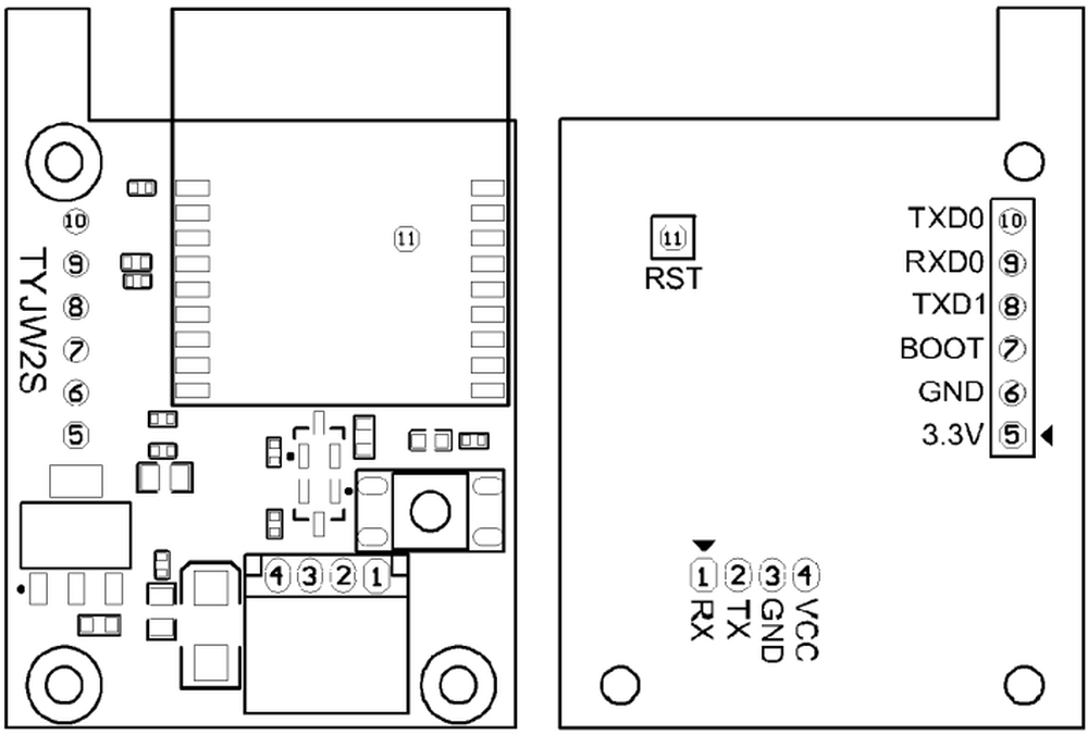 The Tuya TYJW2S-5V-YA datasheet shows the pinout as the following: